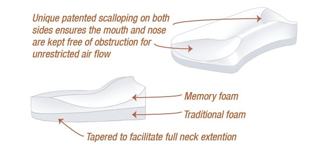Breathe easier with the specifically designed EASY Breather sleep apnoea pillow. Proven effective in improving breathing and reducing snoring while you sleep. The EASY Breather sleep apnoea pillow is a combination of memory foam and traditional foam with a patented scalloped ‘opening’ that facilitates clearer breathing (through ensuring the mouth and nose are free from obstruction). EASY Breather’s sleep apnoea pillow is uniquely designed for use both with or without a CPAP mask.